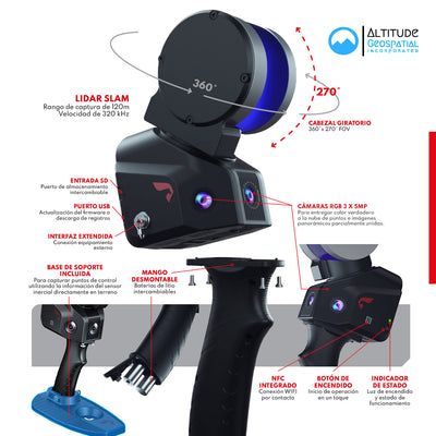 DESCRIPCIÓN Adaptable para diversos escenarios SLAM 100 es el primer escáner LiDAR móvil portátil que utiliza la tecnología SLAM, lanzado por Altitude Geospatial. Este sistema incluye un cabezal giratorio de 360° que permite realizar levantamientos de nubes de puntos con una cobertura de 270°×360°. Combinado con un algoritmo SLAM de nivel industrial, puede obtener datos de nubes de puntos con alta precisión y representatividad, incluso en entornos desafiantes sin señal GNSS. CARACTERÍSTICAS SLAM100 El SLAM 100, es un sistema multiplataforma, escalable que dispone de varios accesorios externos que le permite incrementar su rango de aplicaciones. Pueden integrarse con un módulo GNSS para mejorar la precisión de la trayectoria y ubicar espacialmente la nube de puntos. Además SLAM100 puede montarse sobre un vehículo o un multirotor para enfrentarse a diversos escenarios de captura. Nube de puntos en color real SLAM 100 dispone de tres cámaras de 5 megapíxeles ubicadas estratégicamente para formar un amplio campo de visión de 200° x 100°. A partir de los datos capturados, es posible colorear la nube de puntos y obtener imágenes panorámicas parcialmente unidas. SLAM Go SLAM GO es una aplicación móvil desarrollada en conjunto con el SLAM 100. La aplicación se puede conectar al sistema a través del teléfono celular y permite gestionar proyectos, visualizar nubes de puntos en tiempo real, previsualizar imágenes, actualizar firmware y realizar otras operaciones. La aplicación es compatible con los sistemas operativos Android e iOS. SOFTWARE SLAM GO POST SLAM GO POST, integrado en UAV Manager Professional Edition, es un software para PC compatible con el SLAM 100. Este software permite realizar el postprocesamiento de los datos capturados, generar nubes de puntos en color de alta precisión y representatividad, ademas generar imágenes panorámicas parciales, visualizar nubes de puntos y llevar a cabo un procesamiento de optimización de la nube de puntos. ESPECIFICACIONES LiDAR: ⨭ Rango de captura: 120m ⨭ Tasa de captura: 320 KHz/s ⨭ Clasificación de seguridad: Clase 1 ⨭ Campo de visión: 270° x 360° ⨭ Número de canales: 16 ⨭ Exactitud relativa: + 2cm SISTEMA: ⨭ Peso /Sin batería: 1.58 Kg ⨭ Temperatura de operación: -10° a 45°C ⨭ Plataforma: Dron / Vehículo / Mochila / Mano / Jalón ⨭ Batería Interna: 3350mAh x 4 ⨭ Almacenamiento Interno: 32GB SD ⨭ Autonomía de la batería: 150 minutos ⨭ Humedad ambiental de trabajo: 85%RH CÁMARA RGB: ⨭ Campo de visión: 220° Hz x 100° Vert. ⨭ N° de cámaras: 3 ⨭ Megapíxeles: 5 MP CAPACIDADES: ⨭ Captura GNSS: si (opcional) ⨭ Captura sin luz: ✓ ⨭ Visualización tiempo real: ✓ ⨭ Nube de puntos RGB: ✓ ⨭ Formatos exportación: LAS,PLY,XYZ ⨭ Otras exportaciones: Trayectoria ⨭ Exactitud de mapeo: +5cm VIDEOS DESCARGAS DESCARGAR DATASHEET