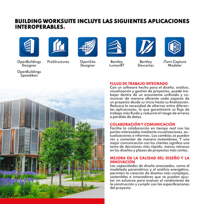DESCRIPCIÓN Diseñe, visualice, comunique y entregue proyectos completos de construcción y sitios con un único conjunto de soluciones convenientes. Incluye un conjunto de aplicaciones sólidas que funcionan a la perfección en una única licencia rentable. Con las capacidades adecuadas, justo donde las necesita y cuando las necesita, puede entregar proyectos completos con mayor eficiencia, precisión e innovación, y generar crecimiento en sus resultados. Disponible solo en suscripción anual Virtuosity CARACTERÍSTICAS BENTLEY Building Worksuite • Diseñe, visualice, comunique y entregue proyectos completos de edificios y zonas de construcción con un conjunto de soluciones convenientes. Presentamos Building WorkSuite, el paquete de software más integral de diseño de edificios y sitios de construcción. Incluye un conjunto de sólidas aplicaciones que funcionan constantemente en una licencia individual y rentable. Con las capacidades correctas justo donde las necesita y en el momento que las necesita, podrá entregar proyectos completos con más eficacia, precisión e innovación, lo cual generará crecimiento en sus ingresos netos. Empiece hoy mismo. • Building WorkSuite incluye las siguientes aplicaciones interoperables: OpenBuildings Designer OpenBuildings GenerativeComponents OpenBuildings Station Designer OpenBuildings Speedikon ProStructures OpenSite Designer Bentley LumenRT Bentley Descartes iTwin Capture Modeler • Diseñe y entregue proyectos seguros, sostenibles y distintivos Flujo de trabajo integrado Con un software hecho para el diseño, análisis, visualización y gestión de proyectos, puede trabajar dentro de un ecosistema unificado y comunicar de manera eficiente cada aspecto de un proyecto desde su inicio hasta su finalización. Reduzca la necesidad de alternar entre diferentes aplicaciones, lo que garantizará un flujo de trabajo más fluido y reducirá el riesgo de errores o pérdida de datos. Colaboración y comunicación Facilite la colaboración en tiempo real con las partes interesadas mediante visualizaciones, actualizaciones e informes. Los cambios se pueden ver y comentar de manera instantánea. Y una mejor comunicación con los clientes significa una toma de decisiones más rápida, menos retrasos en los diseños y plazos de proyectos más cortos. Mejora en la calidad del diseño y la innovación Las capacidades de diseño avanzadas, como el modelado paramétrico y el análisis energético, permiten la creación de diseños más complejos, sostenibles e innovadores que se pueden ajustar sin esfuerzo para evaluar el rendimiento de la construcción y cumplir con las especificaciones del proyecto. Ahorro de tiempo Al aprovechar las capacidades de automatización de diseño e implementar las prácticas mejoradas de gestión de datos, la solución Building WorkSuite ayuda a mejorar significativamente la precisión y a disminuir los caros errores de diseño y la consecuente necesidad de rehacer el trabajo, lo que se traduce en flujos de trabajo de proyectos más eficientes. Escalabilidad Las aplicaciones de Building WorkSuite se pueden adaptar fácilmente a proyectos de diferentes tamaños y complejidades, lo que significa que los equipos no necesitan invertir tiempo en aprender nuevas capacidades o migrar a otros software para diferentes proyectos. ESPECIFICACIONES ⨭ Diseñar, documentar, visualizar y comunicar cada aspecto de un proyecto de construcción y sitio. ⨭ Facilite la colaboración en tiempo real con las partes interesadas. ⨭ Reduzca los errores, ahorre tiempo de diseño y evite retrasos en los proyectos. DESCARGAS Descargar Datasheet