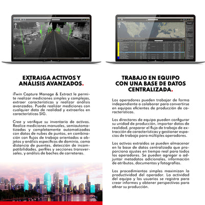 DESCRIPCIÓN iTwin Capture Manage & Extract le permite organizar, catalogar, verificar y ajustar sus datos de realidad, sin importar el tamaño o el tipo. Además, la aplicación de escritorio le permite realizar mediciones simples y complejas, extraer características y realizar análisis avanzados utilizando cualquier dato de realidad. Disponible en versión perpetua y suscripción anual Virtuosity CARACTERÍSTICAS BENTLEY iTwin Capture Manage & Extract • Datos de realidad y SIG tradicionales Escalable e independiente de hardware y cualquier software de posprocesamiento, iTwin Capture Manage & Extract le permite tomar cantidades masivas de imágenes esféricas, imágenes planas, imágenes oblicuas, nubes de puntos y mallas texturizadas, y combinarlas con recursos de SIG tradicionales, como datos vectoriales, ortofotos e imágenes ráster. Importe datos de realidad capturados con sistemas de mapas terrestres, móviles y aéreos, tomados en carreteras, ferrocarriles, agua y aire, tanto en interiores como en exteriores, y sobre el suelo y bajo tierra. • Visualice y navegue Vea y navegue sus datos de cartografía en 2D o 3D, reproduzca automáticamente todas las imágenes compatibles, y superponga cualquier dato vectorial en 2D y 3D. iTwin Capture Manage & Extract le permite configurar varias opciones de leyenda de nube de puntos, como la transparencia y la profundidad de la vista. Al definir los modos de visualización de nubes de puntos puede ver vistas estéreo, de perspectiva e isométricas en 3D. También puede superponer de manera eficaz sus datos de nubes de puntos en imágenes con capacidades de cursor colorizadas para detectar superficies subyacentes, hacer referencia al punto más cercano e interpolar entre puntos para rastrear superficies, bordes y esquinas. • Gestione, catalogue y ajuste datos de realidad iTwin Capture Manage & Extract le permite gestionar, catalogar, acceder, ajustar y verificar sus datos de realidad. Las plantillas inteligentes simplifican y permiten la automatización para importar sus datos de realidad desde cualquier sistema de captura y software de posprocesamiento. Verifique y corrija la precisión de los datos de captura con puntos de control del terreno, ajuste de trayectoria y herramientas para la calibración posterior a la recolección. Catalogue y organice sus datos, y, luego, complete los metadatos y el etiquetado para mantener la visión general de su proyecto, y obtener acceso fácil a cualquier dato en cualquier momento. • Extraiga activos y análisis avanzados iTwin Capture Manage & Extract le permite realizar mediciones simples y complejas, extraer características y realizar análisis avanzados. Puede realizar mediciones con cualquier dato de realidad y extraerlos en características SIG. Cree y verifique su inventario de activos. Realice mediciones manuales, semiautomatizadas y completamente automatizadas con datos de nubes de puntos, en combinación con flujos de trabajo orientados a objetos y análisis específicos de dominio, como distancia de puentes, detección de incompatibilidades, perfiles y secciones transversales, y análisis de baches de carreteras. • Trabajo en equipo con una base de datos centralizada Los operadores pueden trabajar de forma independiente o colaborar para convertirse en equipos eficientes de producción de características. Los directores de equipo pueden configurar su unidad de producción, importar datos de realidad, preparar el flujo de trabajo de extracción de características y gestionar espacios de trabajo para múltiples operadores. Los activos extraídos se pueden almacenar en la base de datos centralizada que proporciona ajustes en tiempo real para todos los operadores. Se pueden agregar o adjuntar metadatos adicionales, información de atributos, documentos y fotografías. Los procedimientos simples maximizan la productividad del operador. La actividad del equipo y los usuarios se registra para crear informes y obtener perspectivas para afinar su producción. ESPECIFICACIONES ⨭ Medir y extraer características de imágenes, nubes de puntos, mallas de realidad, dem y referencias vectoriales ⨭ Mediciones por nubes de puntos, mallas, dem, planos de referencia e intersección hacia adelante ⨭ Reconoce automáticamente puntos, superficies, crestas y esquinas. ⨭ Aplicar mediciones asistidas y automatizadas ⨭ Utilice herramientas avanzadas para la extracción de características de datos de nubes de puntos ⨭ Genere flujos de trabajo de extracción de características rápidos y eficientes ⨭ Generar y exportar perfiles y secciones transversales ⨭ Detección automática de postes y señales de tráfico ⨭ Crear planos de planta en 2D ⨭ Calcular y reportar volúmenes 2.5D ⨭ Caja de herramientas de datos vectoriales SIG ⨭ Guardar mediciones en GIS y exportarlas a CAD VIDEOS DESCARGAS Descargar Datasheet