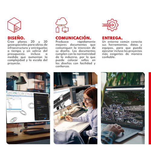 DESCRIPCIÓN MicroStation es el instrumento profesional para diseñar, modelar y gestionar la infraestructura. Ofrece potencia, control, eficiencia y seguridad. Permite a los usuarios ofrecer diseños innovadores y visualizaciones creativas, y consolida elementos críticos del proyecto en un único entorno para obtener resultados de proyecto seguros y efectivos. Disponible en versión perpetua y suscripción anual Virtuosity CARACTERÍSTICAS BENTLEY MICROSTATION • Localice proyectos geoespacialmente: integre información geoespacial de cientos de sistemas de coordenadas compatibles en sus diseños. Acceda a datos de los servidores de mapas web de OGC, utilice datos de GPS en tiempo real, mapas de Microsoft Bing y cree y haga referencia a archivos PDF geoespaciales. • Incorpore formatos de diseño comunes: lea, comparta y consuma fácilmente datos precisos en formatos clave de la industria, como RealDWG™ de Autodesk® (comparta y consuma), IFC (lectura), Esri SHP (lectura) y más. Agregue y ensamble múltiples formatos de archivo, incluidos PDF, U3D, 3DS, Rhino 3DM, IGES, Parasolid, ACIS SAT, CGM, STEP AP203/AP214, STL, OBJ, VRMLWorld, SketchUp SKP y Collada. • Incorpore contenido de diseño referenciado: vea y trabaje con información de diseño de otros en tiempo real mediante referencias en vivo de archivos DGN, DWG y de imágenes grandes en 2D/3D, que se actualizan a pedido. Incluso puede hacer referencia de forma nativa a archivos PDF en sus diseños. ESPECIFICACIONES ⨭ Producir todos los entregables con una sola aplicación ⨭ Explorar más opciones de diseño ⨭ Integrar cualquier tipo de datos ⨭ Localizar y agregar contexto geoespacial VIDEOS DESCARGAS Descargar eBOOK