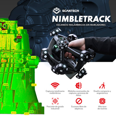 DESCRIPCIÓN NimbleTrack marca el comienzo de la tercera generación de sistemas de escaneo 3D de Scantech, redefiniendo por completo las mediciones 3D. Este avanzado sistema TrackScan cuenta con una potente configuración para su operación sin marcadores y libre de cables, gracias a sus baterías integradas y dispositivos de comunicación totalmente inalámbrica, ofreciendo una libertad absoluta en su uso. CARACTERÍSTICAS SCANTECH NIMBLETRACK Escaneo 3D Eficiente y sin marcadores › El escáner y rastreador 3D NimbleTrack están equipados con avanzados módulos de última generación, permitiendo ofrecer experiencias de escaneo rápidas y fluidas. A diferencia de los escáner 3D portátiles comunes, NimbleTrack no requiere una fuente de alimentación adicional ni la disposición de marcadores reflectivos, lo que simplifica los procesos de medición. Sistema de escaneo láser inalámbrico › NimbleTrack ha eliminado por completo la necesidad de cables para alimentar el instrumento o transferir datos. Las capturas en campo no serán un problema, incluso cuando no haya suministro de energía. El sistema escáner 3D cuenta con una potente batería incorporada, y el rastreador óptico incorpora baterías recargables para ofrecer un ciclo de energía dual, garantizando operaciones continuas durante mucho tiempo. Precisión de Grado Industrial › NimbleTrack permite a los usuarios capturar datos 3D con un alto nivel de representatividad y una precisión de grado industrial de hasta 0,025mm. Además una precisión volumétrica de 0,064mm hasta los 3.2 metros. Esto es posible gracias al potencial de los productos de metrología de Scantech, que incluyen tecnología de láser azul, una gran velocidad de captura de 4.9 millones de mediciones por segundo, y algoritmos avanzados de captura y procesamiento de datos. Compacto y ergonómico › NimbleTrack establece un nuevo estándar para los sistemas de escaneo óptico 3D. Su diseño compacto y ligero permite medir de forma precisa componentes en diversas condiciones. El sistema óptico iTracker, con un peso de 2.2 kg y unas dimensiones de 57 cm, posibilita el seguimiento del sensor láser en un rango de hasta 3.2 m. Por otro lado, el módulo escáner 3D, con un peso de 1.3 kg y una estructura de fibra de carbono, ofrece una facilidad de operación excepcional y la capacidad de capturar en espacios reducidos gracias a su diseño compacto y una distancia corta entre cámaras. ESPECIFICACIONES ⨭ Capturas totalmente inalámbrica ⨭ Módulos avanzados de captura y proceso de datos ⨭ Diseño compacto y ergonómico ⨭ Precisión de grado industrial ⨭ Escaneo libre de objetivos ⨭ Alta tasa de rastreo VIDEOS DESCARGAS Descargar Datasheet