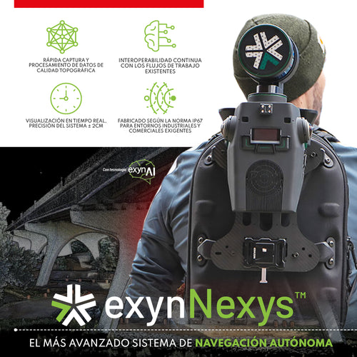 DESCRIPCIÓN Modular y listo para cualquier entorno Nexys es un sistema de captura de información geoespacial basada en la tecnología SLAM, completamente modular, el cual entrega una flexibilidad excepcional para adaptarse a una amplia gama de escenarios de captura de forma rápida, representativa y altamente segura. Con diferentes configuraciones de montaje y niveles de autonomía, Nexys puede adaptarse a diferentes entornos ya sea en configuración portátil, montado en mochila, vehículo o integrado en robots aéreos en espacios subterráneos, entregando capacidades de navegación autónoma a partir de su nivel 4 de autonomía, Nexys garantiza una captura eficiente y representativa de datos geoespaciales. Además la visualización en tiempo real de los datos capturados con detalles de color si es necesario brinda una mayor comprensión de la información que se está capturando para su posterior análisis. CARACTERÍSTICAS ⨭ Opciones de uso flexibles: portátil, mochila, vehículo o plataforma robótica ⨭ Levantamiento geoespacial 3D que permite capturar hasta 1,9 millones de puntos por segundo ⨭ Precisión topográfica de hasta ±2 cm (dependiendo del entorno) ⨭ Visualización en tiempo real de nubes de puntos coloreadas a través de una tableta reforzada ⨭ Capacidad de edición in situ de nube de puntos: suavizar, reducir la muestra y georreferenciar nube ⨭ Fabricado según la norma IP67 para entornos exigentes TABLET ⨭ Pantalla 12” ⨭ IP 65 ⨭ Sistema operativo Linux (Ubuntu 22.04) ⨭ Software interface exynview™, control de la misión y flujo de datos en tiempo real. VIDEOS DESCARGAS DESCARGAR DATASHEET