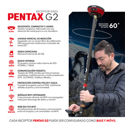 DESCRIPCIÓN Incluye nueva colectora Android PENTAX P300 El nuevo GNSS Pentax G2 presenta un diseño compacto, resistente y ligero, para un uso duradero. Posee gran capacidad de memoria y opciones de comunicación versátil, permitiendo un rastreo simultáneo multifrecuencia y multiconstelación: GPS, GLONASS, Galileo y Beidou. El receptor incluye radio interna, módulo Wifi integrado y está equipado con un sensor libre de calibración IMU que permite mediciones inclinadas de hasta 60°. CARACTERÍSTICAS ⨭ Fabricado en Japón ⨭ Tiempo inicialización: < 10 seg. ⨭ Memoria Interna 32GB ⨭ Tarjeta de 1408 canales permite el rastreo simultáneo multifrecuencia y multiconstelación: GPS, GLONASS, Galileo y Beidou. ⨭ Protección IP68 ⨭ Módulo WIFI integrado ⨭ Web GUI vía WIFI ⨭ Radio interna de 410- 470Mhz / 1 Watt ⨭ INCLUYE NUEVA COLECTORA ANDROID PENTAX P300 (64 GB de almacenamiento, Bluettoh y Wi-Fi, teclado y módem 4G incorporado) ⨭ CADA RECEPTOR PENTAX G2 PUEDE SER CONFIGURADO COMO BASE Y MÓVIL DESCARGAS DESCARGAR DATASHEET
