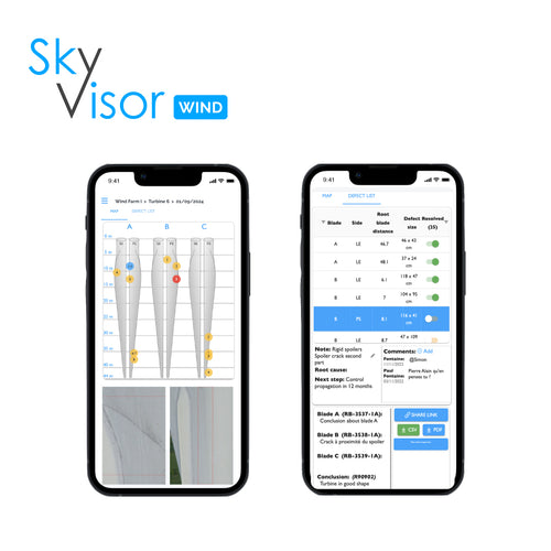 DESCRIPCIÓN SkyVisor Wind es una suite de software de vanguardia diseñada para automatizar y simplificar las inspecciones de aspas de aerogeneradores. En solo 18 minutos por turbina, esta herramienta todo en uno permite inspecciones rápidas y eficientes que apoyan las necesidades de mantenimiento diario, minimizando el tiempo de inactividad y reduciendo los costos operativos. Con tecnología de gemelo digital para una gestión mejorada de activos, SkyVisor ofrece vuelos de drones 100% autónomos, capturando datos de alta calidad mediante adquisición basada en drones y ayudándote a encontrar defectos rápidamente usando las potentes herramientas de IA de nuestra plataforma. ¡Toma el control del proceso de inspección hoy y optimiza la toma de decisiones con SkyVisor Wind para una gestión de activos proactiva y rentable! Áreas de Aplicación SkyVisor Wind sirve tanto a parques eólicos terrestres como marinos, adaptándose a turbinas de cualquier diámetro y fabricante. Ya sea inspeccionando aspas o torres de turbinas, nuestra solución proporciona inspecciones rápidas, precisas y automatizadas, permitiéndote gestionar el mantenimiento de manera proactiva y eficiente. Tu Suite de Software Todo en Uno SkyVisor proporciona una suite de software integrada diseñada para la recolección automática y eficiente de datos, resolución colaborativa de problemas y gestión integral de activos. La App de Dron, App de Campo y Plataforma Web trabajan en perfecta armonía para optimizar tus inspecciones de aerogeneradores y el rendimiento de los activos: App de Dron SkyVisor: Captura datos visuales de alta resolución con vuelos autónomos de drones, permitiendo una inspección rápida y precisa, incluso en condiciones desafiantes. Plataforma Web SkyVisor: Planifica inspecciones, rastrea actividades de mantenimiento y genera informes desde una plataforma centralizada impulsada por herramientas de detección de defectos basadas en IA. App de Campo SkyVisor: Empodera a tus equipos con acceso instantáneo a datos, hilos de compartición de archivos e imágenes, asegurando una respuesta rápida y colaboración eficiente para resolver problemas en el sitio. CARACTERÍSTICAS SkyVisor Wind Solución In-House: solución de inspección interna que devuelve el control a tu equipo Vuelo eficiente de 18 minutos por turbina: inspección rápida y optimizada Operación Totalmente Autónoma: inspección automática que garantiza un tiempo mínimo de inactividad y máxima seguridad Datos de Alta Resolución: adquisición de 120 imágenes de alta calidad por aspa, proporcionando datos visuales completos para una detección y análisis preciso de defectos Cumplimiento con Estándares de la Industria: inspección industrial bajo el estándar IEC adaptable a diversos modelos y especificaciones de turbinas Impulsado por IA: herramientas avanzadas de detección de defectos basadas en Inteligencia Artificial. Un asistente digital experto en aspas, que permitirá detectar defectos de manera más rápida y eficiente Informes Optimizados: Genera sin esfuerzo informes digitales detallados y compartibles para una comunicación fluida con las partes interesadas VIDEOS DESCARGAS Descargar Datasheet