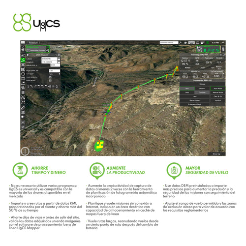 ¿QUÉ ES UgCS? Acrónimo del inglés Universal Ground Control Software , UgCS es un software multiplataforma desarrollado por SPH Engineering que está diseñado para planificar y controlar misiones de vuelo realizadas con drones de diversas marcas. Actualmente, UgCS es compatible sistemas marca DJI, Autel, MAVLink, Freefly , entre otros. ¿CÓMO FUNCIONA EL LICENCIAMIENTO EN UgCS? La licencia funciona mediante un código de activación. Actualmente existen 4 tipos diferentes de licencias: 1. UgCS Pro: Incluye funciones necesarias para la planificación de vuelos fotogramétricos (mapeo convencional, lineal, circular, vertical, waypoint y perímetros). Su licenciamiento mediante código de activación puede ser perpetuo o por suscripción. 2. UgCS Expert: Incluye planificación LiDAR de mapeo y lineal con sus respectivas maniobras de calibración de IMU (también posee las funciones descritas para la licencia Pro). Su licenciamiento mediante código de activación puede ser perpetuo o por suscripción. 3. UgCS Enterprise: Incluye funciones para videovigilancia mediante transmisión de video en vivo (también posee las funciones de la licencia Expert). Su licenciamiento mediante código de activación puede ser perpetuo o por suscripción. 4. UgCS Commander: Es una licencia diseñada para administrar simultáneamente múltiples drones en misiones automatizadas (también posee todas las funciones de UgCS Enterprise). QUÉ DRONES DJI SON COMPATIBLES CON UgCS? ⨭ DJI Phantom 4 RTK * Sólo con la versión SDK Remote Controller, es decir, con el RC que no trae pantalla integrada ⨭ DJI Mavic 3 Enterprise ⨭ DJI Matrice 30 Series ⨭ DJI Matrice 300 RTK ¿Qué se requiere para ejecutar UgCS con nuestro dron DJI Enterprise? Se necesitará de un computador en donde se instalará UgCS versión de escritorio, así como de un control remoto que permita instalar el programa en el control remoto. En la actualidad, UgCS es compatible con los controles remotos DJI Smart Controller (de Matrice 300 RTK), DJI RC Plus (de Matrice 30) y DJI RC Pro Enterprise (de Mavic 3 Enterprise). ¿Cúales son las fortalezas de UgCS sobre DJI Pilot 2? Recordemos que DJI Pilot 2 es el software utilizado para planificar/volar con nuestros drones Mavic 3 Enterprise, Matrice 30 y Matrice 300 RTK. UgCS destaca sobre este software al ofrecer una mayor diversidad de estrategias de planificación de vuelo: Mapeo convencional, lineal, circular, vertical, waypoint, perímetros y escaneo LiDAR. VIDEOS DESCARGAS DESCARGAR DATASHEET