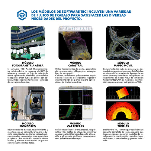 DESCRIPCIÓN Trimble Business Center (TBC) es un software de procesamiento de datos geoespaciales líder en la industria, diseñado para profesionales de la topografía, cartografía, ingeniería civil, y construcción que necesitan gestionar datos con precisión y eficiencia. Con TBC, los usuarios pueden procesar y analizar datos de diversas fuentes, como estaciones totales, sistemas GNSS, drones y escáneres láser, permitiendo la creación de modelos topográficos detallados, cálculos de volúmenes, y análisis geoespaciales avanzados. Trimble Business Center es la solución integral para mejorar la productividad en proyectos de diseño y construcción, proporcionando herramientas avanzadas para la edición, visualización, y análisis de datos geoespaciales. Con soporte para flujos de trabajo de campo a oficina, este software ofrece integración directa con equipos de topografía y dispositivos GNSS de Trimble, permitiendo un flujo de datos eficiente y preciso. CARACTERÍSTICAS TRIMBLE TBC Procesamiento de datos GNSS, topográficos y fotogramétricos: Trabaja con datos de múltiples sensores y formatos para crear modelos precisos y detallados. Herramientas avanzadas de edición y análisis: Facilita la edición, limpieza, y ajuste de datos, además de ofrecer análisis avanzados como volúmenes y cálculos de corte y relleno. Integración perfecta con equipos de campo Trimble: Transferencia de datos eficiente y sin errores entre el software y los equipos Trimble para un flujo de trabajo optimizado. Visualización 3D y herramientas de diseño: Modelado de superficies, curvas de nivel, y creación de planos en 2D y 3D para facilitar la interpretación y planificación de proyectos. Soporte para colaboración y exportación de datos: Compatible con múltiples formatos de exportación y opciones para compartir datos con equipos de trabajo y stakeholders. Optimiza la gestión de tus datos geoespaciales y mejora la productividad de tus proyectos con Trimble Business Center, el software imprescindible para profesionales de la topografía, ingeniería y construcción. ÁREAS DE APLICACIÓN TBC Topografía y Cartografía: Procesamiento y ajuste de datos topográficos, generación de planos, y creación de modelos digitales de terreno (DTM). Ingeniería Civil y Construcción: Diseño de obras civiles, gestión de proyectos de infraestructura, cálculo de volúmenes y análisis de movimiento de tierras. Geomática y GIS: Integración con sistemas de información geográfica (GIS), creación de mapas y análisis espacial para la toma de decisiones. Minería y Exploración: Planificación y monitoreo de explotaciones mineras, modelado del terreno y evaluación de recursos. Agricultura de Precisión: Análisis geoespacial de terrenos agrícolas para optimizar el uso de recursos y mejorar la productividad. VIDEOS DESCARGAS Actualizaciones TBC Descargar Datasheet