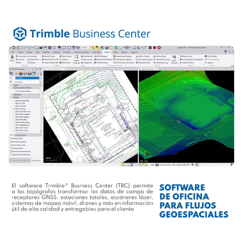 DESCRIPCIÓN Trimble Business Center (TBC) es un software de procesamiento de datos geoespaciales líder en la industria, diseñado para profesionales de la topografía, cartografía, ingeniería civil, y construcción que necesitan gestionar datos con precisión y eficiencia. Con TBC, los usuarios pueden procesar y analizar datos de diversas fuentes, como estaciones totales, sistemas GNSS, drones y escáneres láser, permitiendo la creación de modelos topográficos detallados, cálculos de volúmenes, y análisis geoespaciales avanzados. Trimble Business Center es la solución integral para mejorar la productividad en proyectos de diseño y construcción, proporcionando herramientas avanzadas para la edición, visualización, y análisis de datos geoespaciales. Con soporte para flujos de trabajo de campo a oficina, este software ofrece integración directa con equipos de topografía y dispositivos GNSS de Trimble, permitiendo un flujo de datos eficiente y preciso. CARACTERÍSTICAS TRIMBLE TBC Procesamiento de datos GNSS, topográficos y fotogramétricos: Trabaja con datos de múltiples sensores y formatos para crear modelos precisos y detallados. Herramientas avanzadas de edición y análisis: Facilita la edición, limpieza, y ajuste de datos, además de ofrecer análisis avanzados como volúmenes y cálculos de corte y relleno. Integración perfecta con equipos de campo Trimble: Transferencia de datos eficiente y sin errores entre el software y los equipos Trimble para un flujo de trabajo optimizado. Visualización 3D y herramientas de diseño: Modelado de superficies, curvas de nivel, y creación de planos en 2D y 3D para facilitar la interpretación y planificación de proyectos. Soporte para colaboración y exportación de datos: Compatible con múltiples formatos de exportación y opciones para compartir datos con equipos de trabajo y stakeholders. Optimiza la gestión de tus datos geoespaciales y mejora la productividad de tus proyectos con Trimble Business Center, el software imprescindible para profesionales de la topografía, ingeniería y construcción. ÁREAS DE APLICACIÓN TBC Topografía y Cartografía: Procesamiento y ajuste de datos topográficos, generación de planos, y creación de modelos digitales de terreno (DTM). Ingeniería Civil y Construcción: Diseño de obras civiles, gestión de proyectos de infraestructura, cálculo de volúmenes y análisis de movimiento de tierras. Geomática y GIS: Integración con sistemas de información geográfica (GIS), creación de mapas y análisis espacial para la toma de decisiones. Minería y Exploración: Planificación y monitoreo de explotaciones mineras, modelado del terreno y evaluación de recursos. Agricultura de Precisión: Análisis geoespacial de terrenos agrícolas para optimizar el uso de recursos y mejorar la productividad. VIDEOS DESCARGAS Actualizaciones TBC Descargar Datasheet